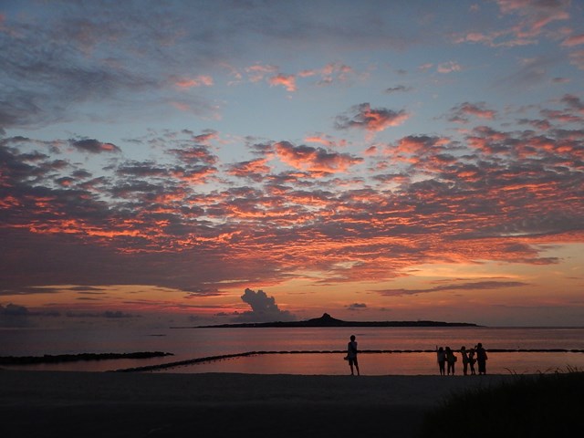 山が目立つ伊江島をバックに、空が真っ赤になる光景は見事でした。