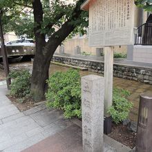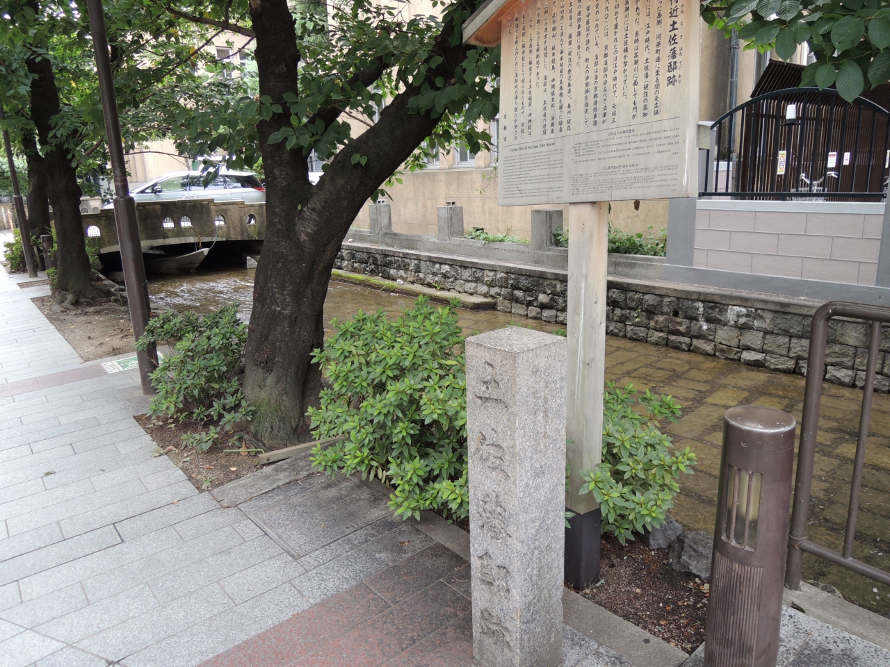 高瀬川のほとりに石碑が建つこの地には江戸初期から明治4(1871)年まで土佐藩主山内家の大きな藩邸があったところです。土佐藩士だった龍馬は山内容堂から脱藩の罪を許されたが、翌文久3年の2月に、この土佐藩邸で7日間謹慎を命ぜられています。