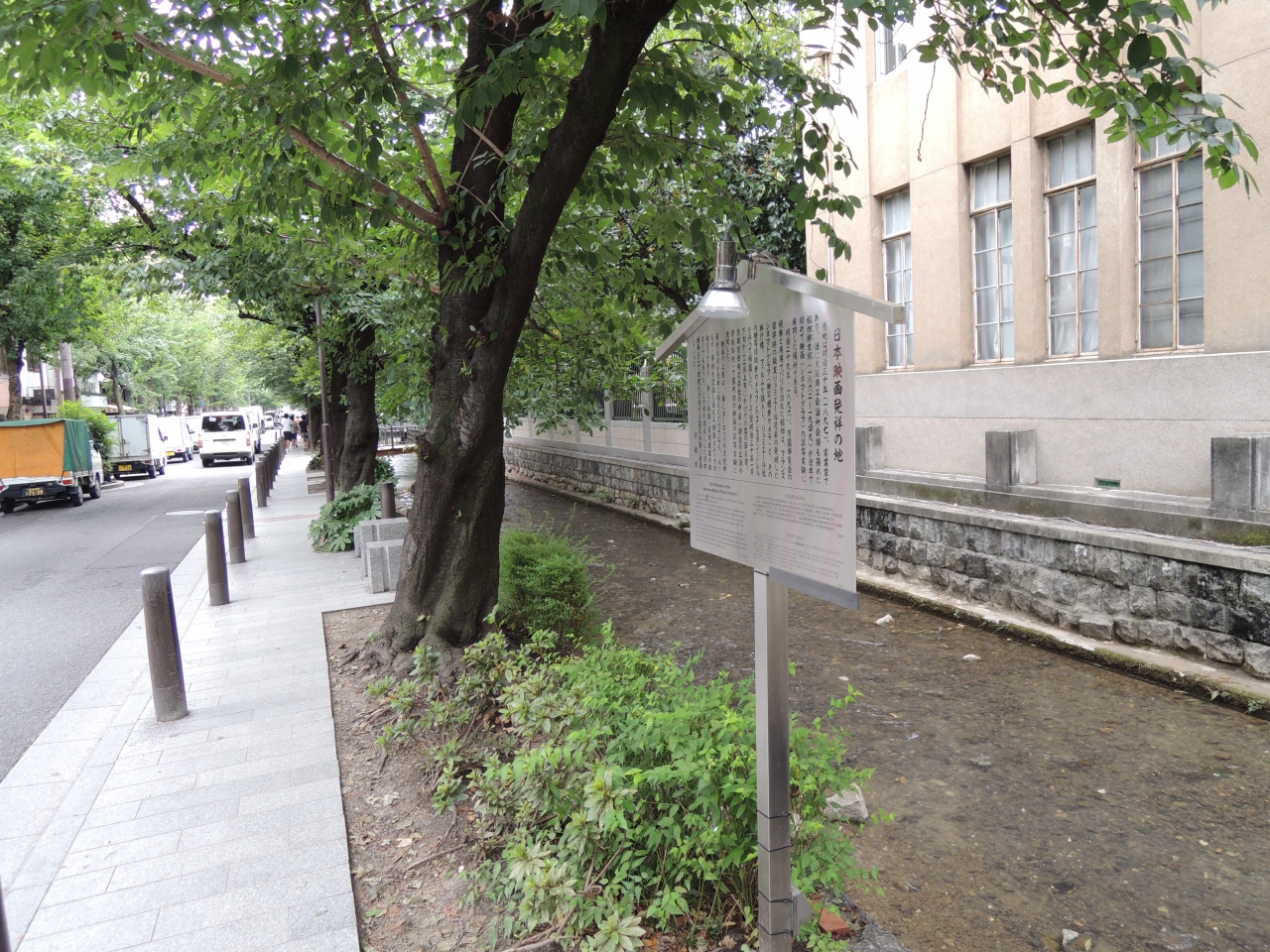 稲畑勝太郎(1852~1949)が日本で初めて映画の試写実験に成功した場所です。京都電燈株式会社の中庭で国内初の映画の試写実験に成功した。映画の上陸は、新しい娯楽・芸術産業の始まりでもあり、日本映画は二十世紀を代表する娯楽に成長していくことになりました。