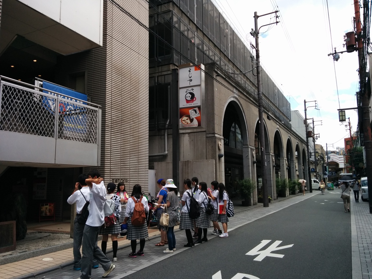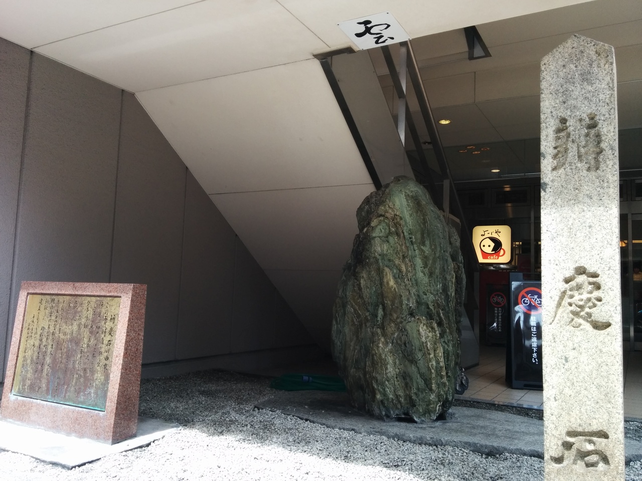 三条通麩屋町交差点を少し東入る三条通沿い北側にある、あぶらとり紙で有名な「ようじや」さんのお店前に『弁慶石』があります。