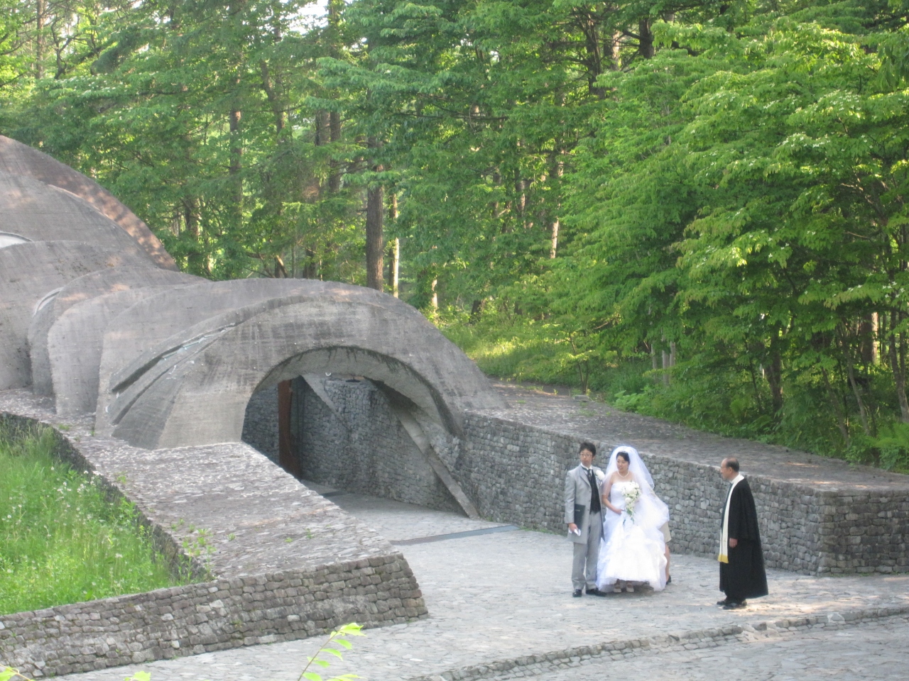 こういう、石を前面に押し出した教会って、ありそうでなかなか無いですよね!石だからといって冷たい感じはまったくしなくて、曲線のフォルムが美しくてとっても素敵です!結婚式をされているカップルがいました!居心地の良い教会だと思います!