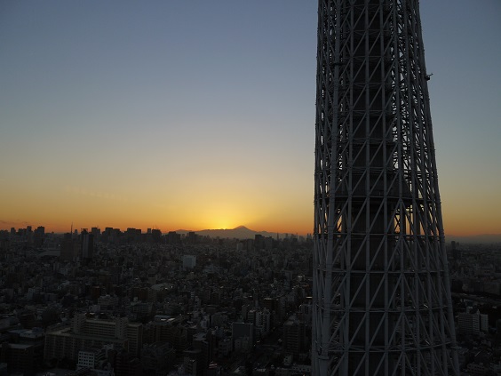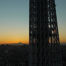 スカイツリーの展望には上がらず、夕刻隣接するビルの最上階からスカイツリーを眺めていたらツリーの左奥に富士山がシルエットで現れた。スカイツリーの骨格と富士山のツーショットですこれはツリーに登ると見れない光景です。