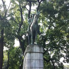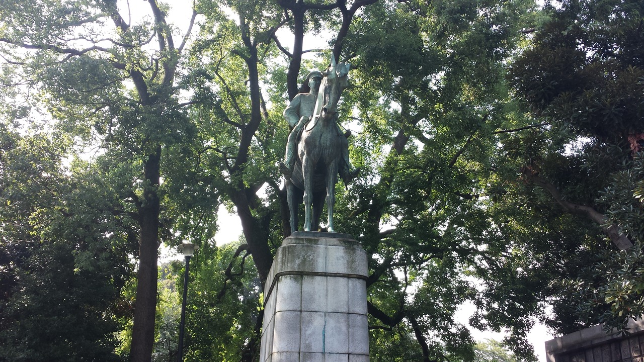 靖国神社や地下鉄の九段下駅から徒歩2分ほどの立地です。牛ヶ淵沿いに小さな公園があり、馬に乗る大山巌像が見上げるようなかたちで建っています。大山巌は薩摩藩出身で、日露戦争などで活躍した陸軍大臣とのことです。