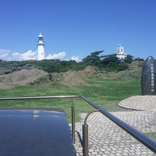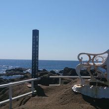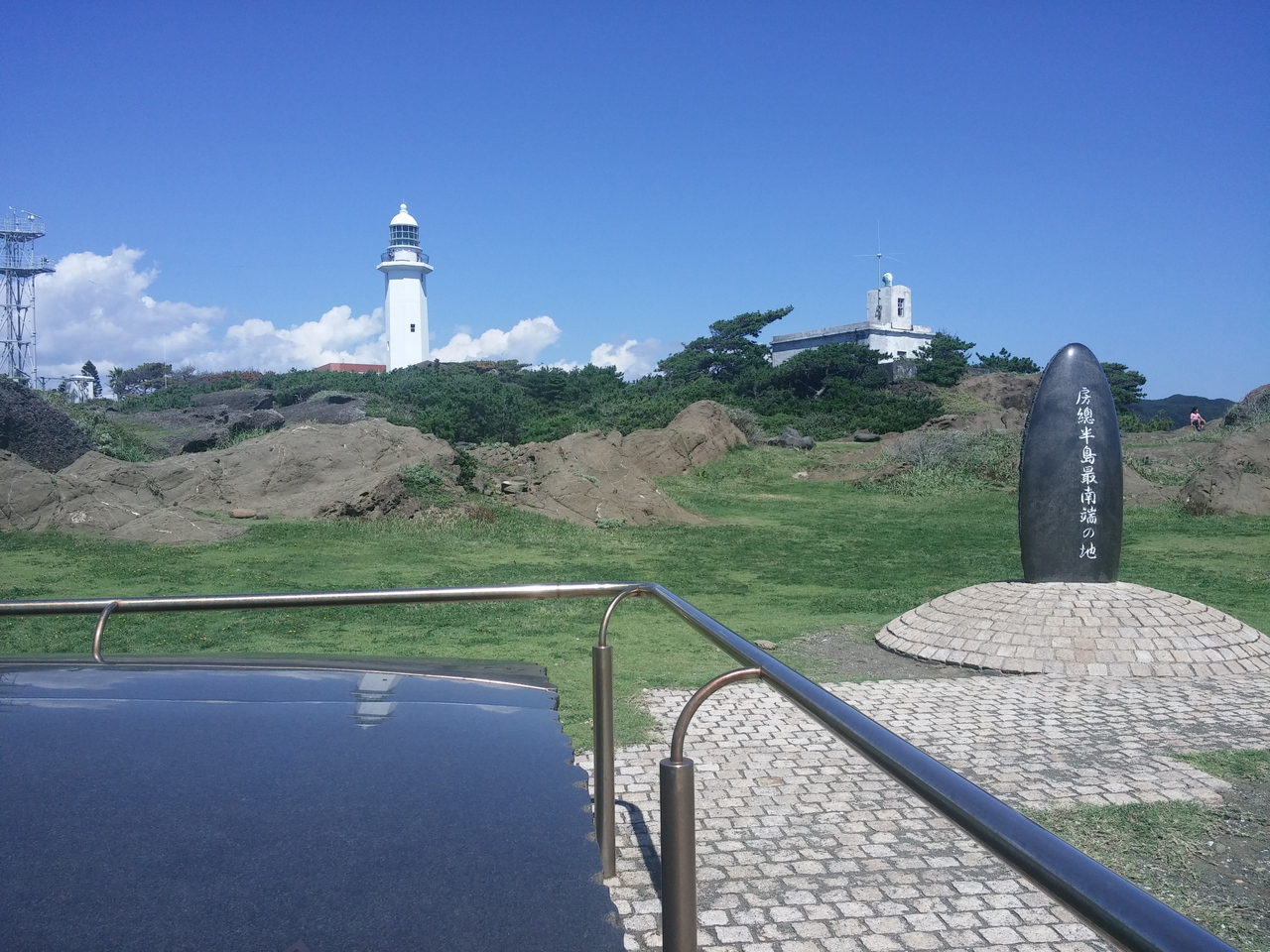 千葉県最南端の野島崎。岬のとっさきには最南端のモニュメントとベンチが設置されています。青空に映えてステキ!ベンチからは朝日と夕日が眺められます。その下には巨大な御影石。ピラミッドを作った石ひとつと同じ大きさだそう。ツルツルの御影石には白亜の灯台が映ります。