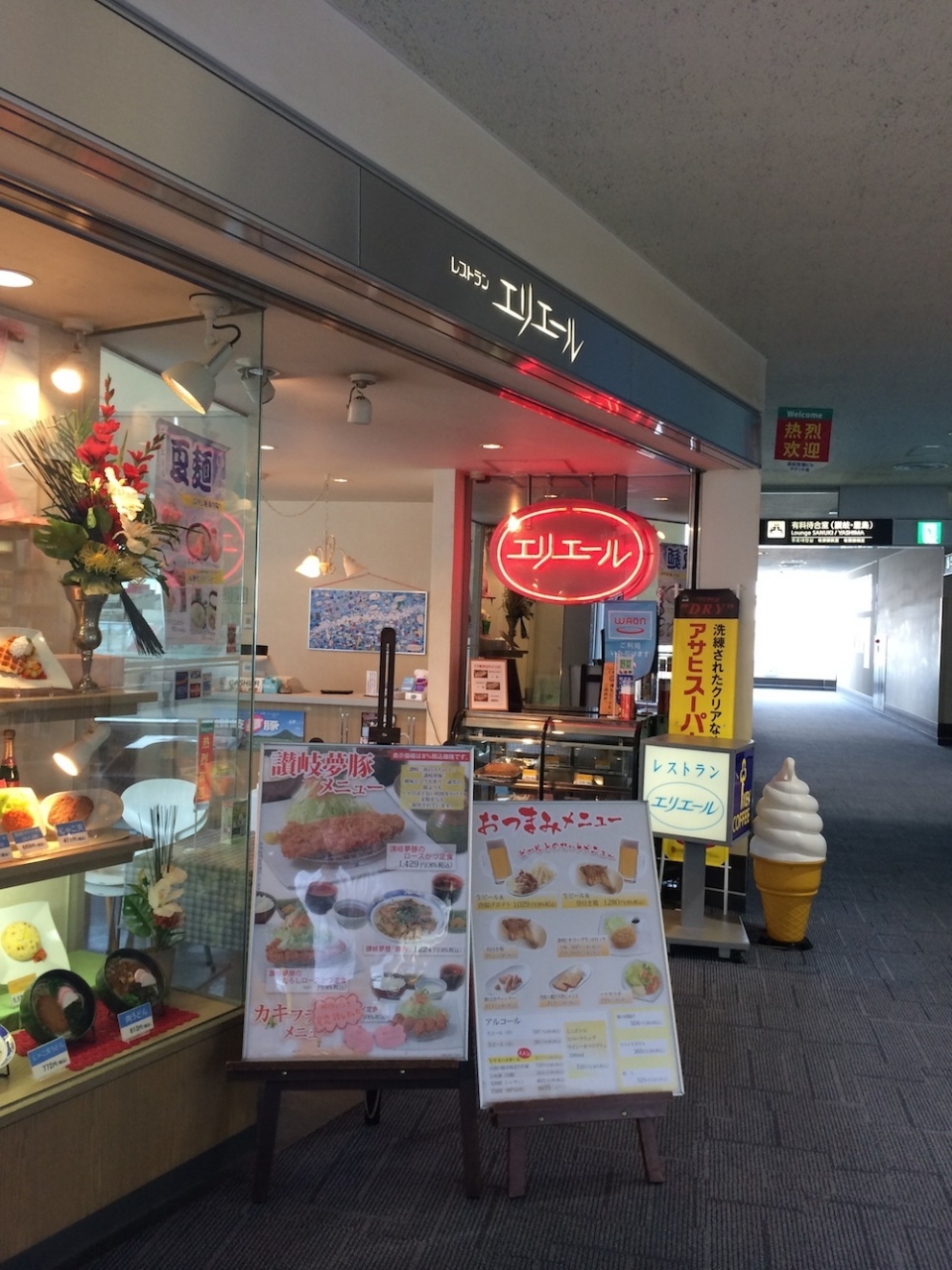 アイスクリームからワッフルといった甘味、それに、カレーなど各種食事まで全て揃う高松空港唯一のフルラインナップのレストラン。とはいえ、ちょっとしたファミリーレストラン感覚。値段はやや高いものの、空港にしては安いです。また、ビューが非常にいいので、落ちついて食事ができます。