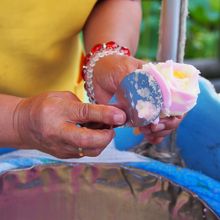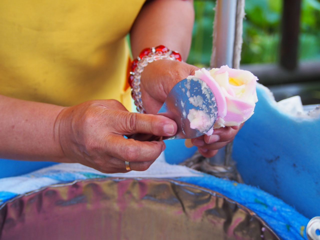 おばあさん(ババ)がヘラで器用にお花の形のアイスを作ってくれるババヘラアイス。
