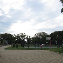 が、展望台もあると知り訪問。案内図によると、公園部分は動物園を挟むような形になっていました。展望台があるほうは高台の広場で、珍しくバスケットコート(フェンスあり)がありました。子どもが遊べる遊具などは、その反対側にあるようです。
