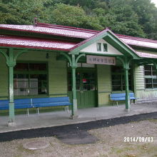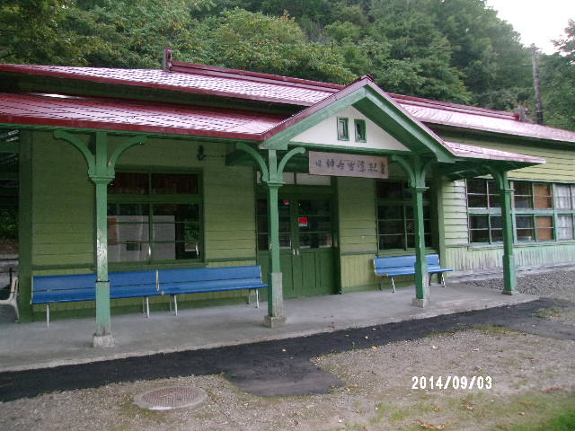 神居古潭の駐車場に車を止め、白い橋を渡り遊歩道を少し上ったところにありました。私たちが行ったのは早朝で、誰もいないうえに駅自体が山を背に深い緑の中にあるため、今にも熊が出そうで怖かったです。駅舎はきれいで保存状態も良いです。近くにはSLも置かれていました。旧函館本線の駅ということですが、旧線跡はサイクリングロードになっていました。