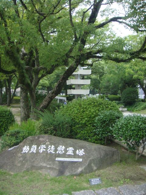 元安橋の横に1967(昭和42)年7月15日財団法人広島県動員学徒犠牲者の会によって建立された塔です。戦時中広島市内には8,400人の生徒が建物疎開作業を行っており、その内の約6,300人が原爆の犠牲となりました。慰霊碑には全国から来た戦没学徒の出身校が刻まれていました。