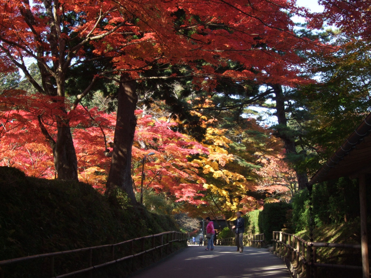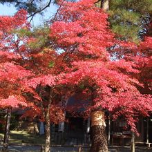 紅葉した木々の見事さに感嘆の溜息が出てしまいます。ここは奥州藤原氏が造営し、世にも名高い金色堂が鎮座する中尊寺。金色堂の中はまさに金・金・金…見事な国宝です。今回は、その建築物に彩りを添える木々たちが主役。楓の赤が見事ですね。