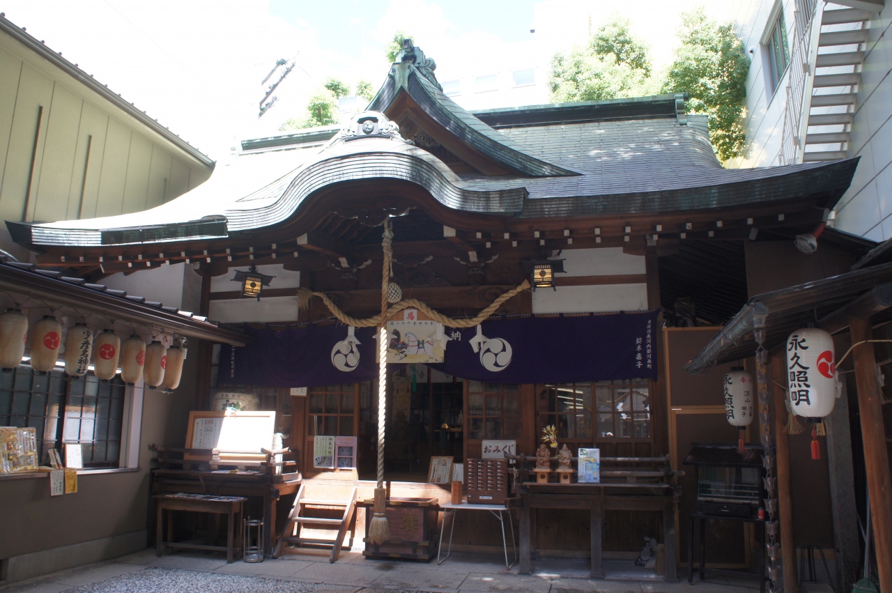 少彦名神社は、薬問屋の街、道修町の一角。ビルの脇を通った先が境内です。