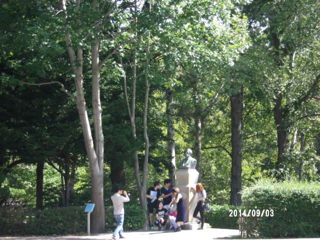 北海道大学の学食で昼食を取ろうと構内を歩いていると、交差点の角に多くの人が集まっていました。指さす全身像(羊ケ丘)が有名なクラーク博士の上半身の像がありました。観光客が写真を撮り合っていたので近づいてみませんでしたが、遠目にはかなり小さく見えました。やはり、絵になる羊ケ丘の像には負けるかな。