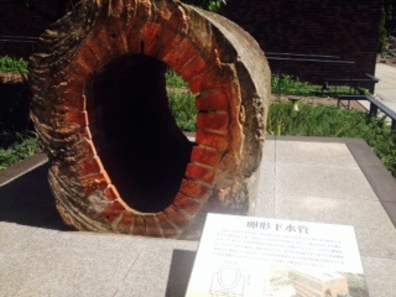 横浜情報文化センターの中庭部分に他の土木遺構などと一緒に陳列されている。外国人居留地は、埋め立て地で水捌けも悪かったらしい。そこで、外国人は、本国の技術を活かして下水道を造った。一番最初は陶管だったが、明治10年代に入り、煉瓦造になったそうだ。