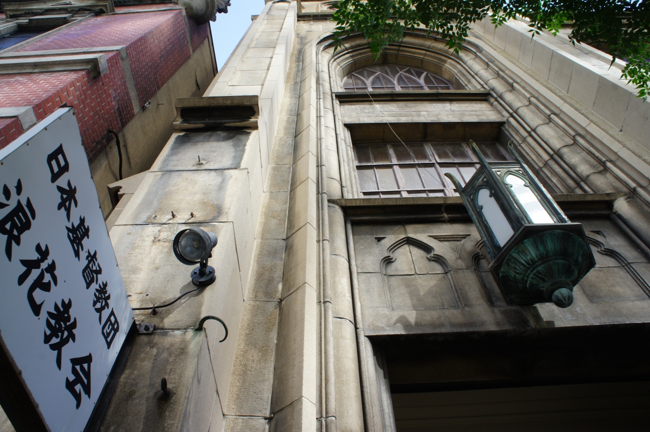 日本基督教団浪花教会の創立は、明治10年。現在の教会堂は、昭和5年に竣工したもので、アメリカ人建築家ヴォーリズの設計指導によるものです。二階が礼拝堂でしたが、派手なステンドグラス等はありません。外観のレトロな雰囲気を楽しむのがいいと思います。