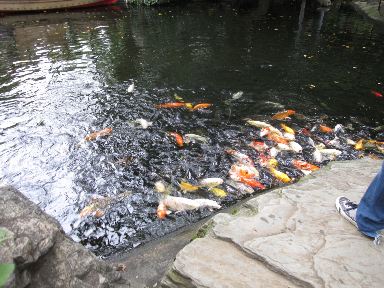 鯉が泳いでいる池があり、餌も売っているようです。人が近づくと期待するのか、鯉が寄ってきて口を開けていました。