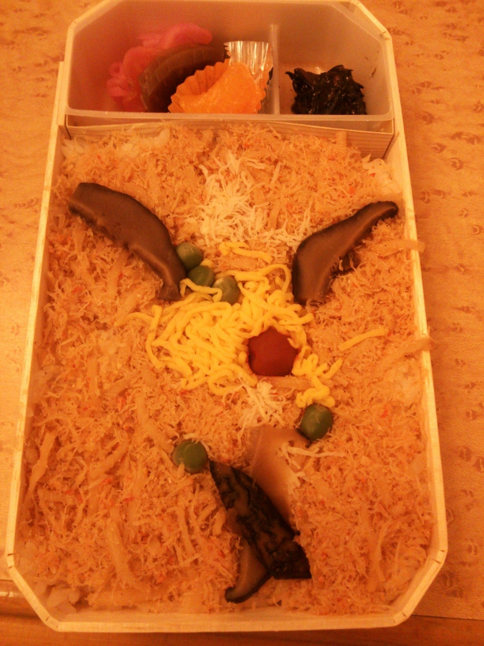 の他、筍、椎茸等が乗っていて、付け合わせに佃煮やみかん、お新香がつくという内容でしたが、何の味付けか分かりませんが蟹に絶妙な味付けをしていて、筍の食感とともに食べてて飽きない味つけでした。