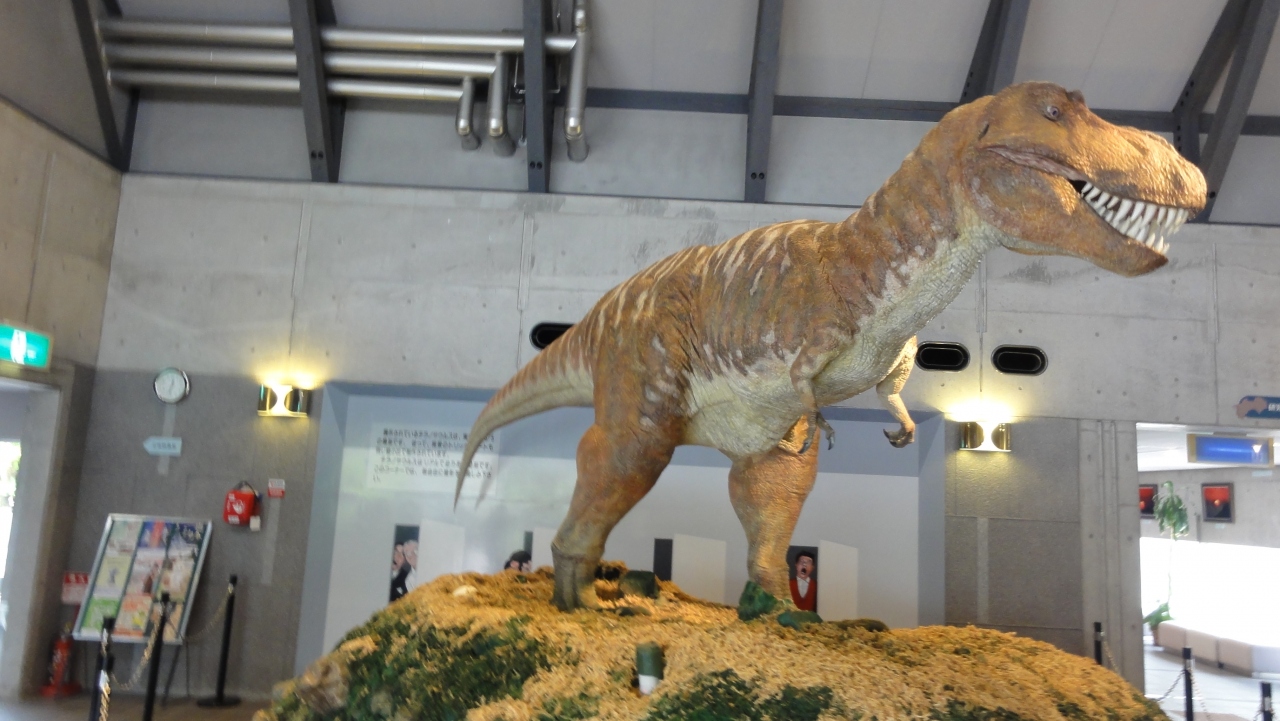 管内に入ると、大きな恐竜の動く模型が入場者を迎えてくれます。太古の昔に大陸が形成されていった経緯を説明するコーナーから、地元・佐川の地質を紹介したコーナーなど、少し小ぶりの展示館ですが、丁寧に展示しています。佐川から出土したさまざまな化石類も。