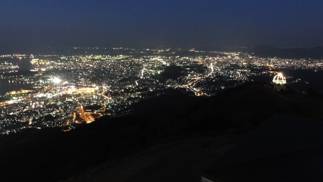 北九州市の西部にそびえる皿倉山は北九州の夜景を楽しめるスポットです。JR八幡駅前からケーブルカーの乗り場まで無料のシャトルバスが出ています。ケーブルカーで終点まで上がると、今度は斜行エレベーターに乗り換え、展望台に向かいます。展望台は屋外と屋内の両方から景色が楽しめますが、やはり屋外から直接ながめるのがよかろうかと。しかし冬季はちょっと寒さが厳しいかも。展望レストランも併設しています。
