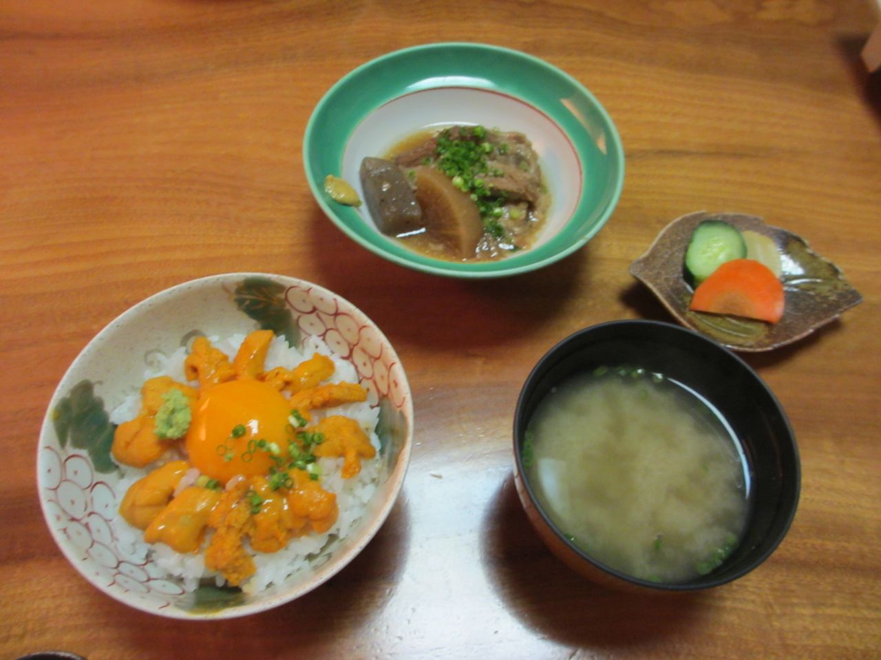 ウニ丼には、お刺身、煮付けやみそ汁、漬け物もつきます。