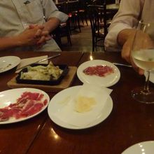 生ハム、牡蠣とほうれん草の鉄板焼き、アンチョビのキャベツ炒め、牛肉のステーキ風など、みんなでシェアー。