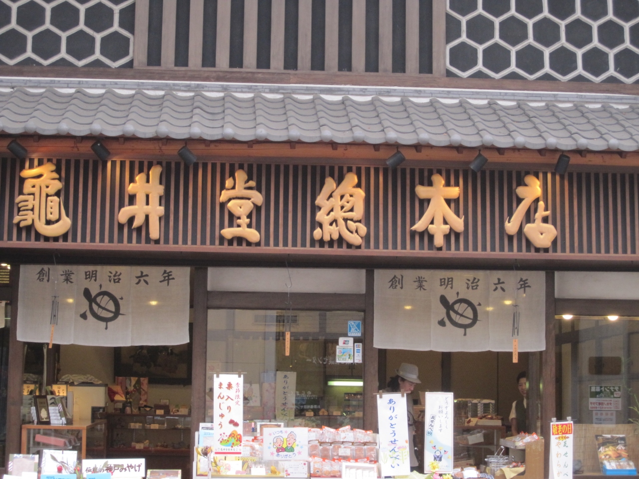 元町商店街の西の方にある老舗の和菓子屋さんです。100年以上の歴史があります。こちらで有名なのは「瓦せんべい」です。おせんべいなのですが、甘くてちょっとクッキーみたいな感じです。絵柄は楠公が書かれています。