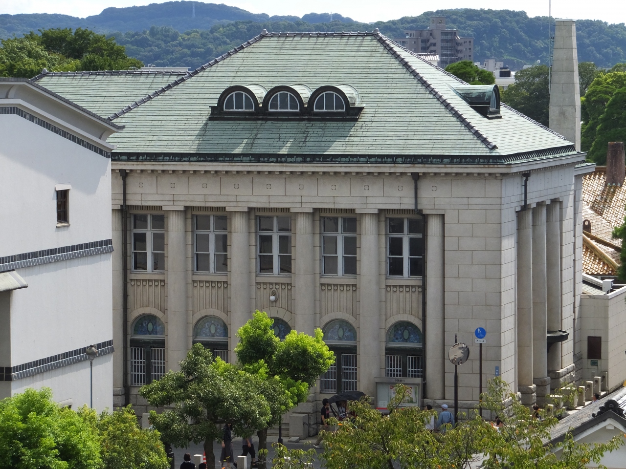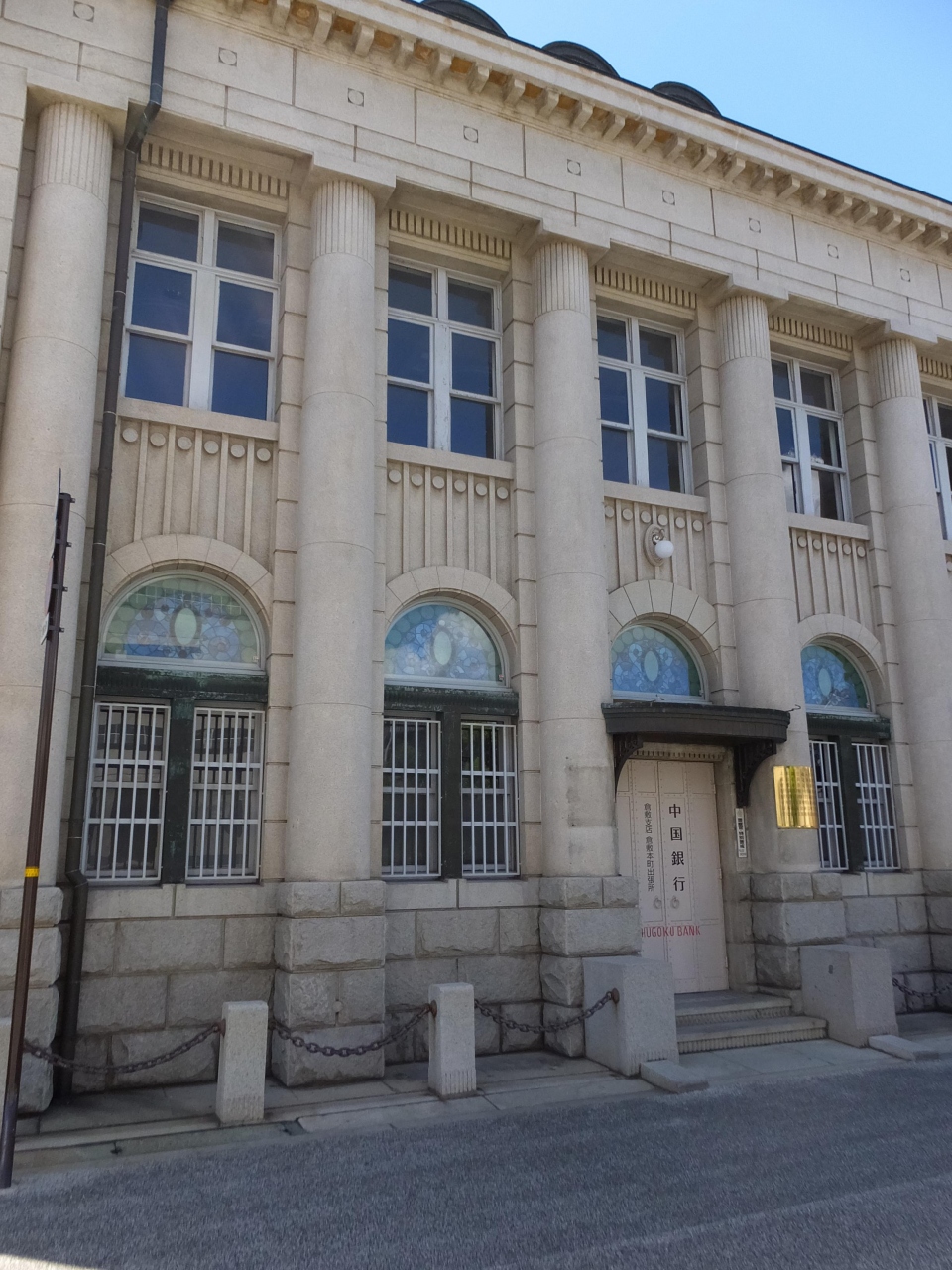 ルネサンス式の洋風の建物です。本通り商店街の端にあり、現在も銀行の建物として使われていますが建物の荘厳さもあり記念写真を撮っている人が何人かいました。ここから倉敷倉敷公民館の方へ進み、トンネル脇の観龍寺への石段を上がったところから見ると、建物の全体がよく見えます。