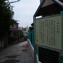 案内板には「富士見坂」という名前がつく坂の中でも数少ない富士が本当に見える坂、とあるのですが、この案内板が立ってから状況が変わってしまったらしく今では富士見をすることはかなわないそうです。