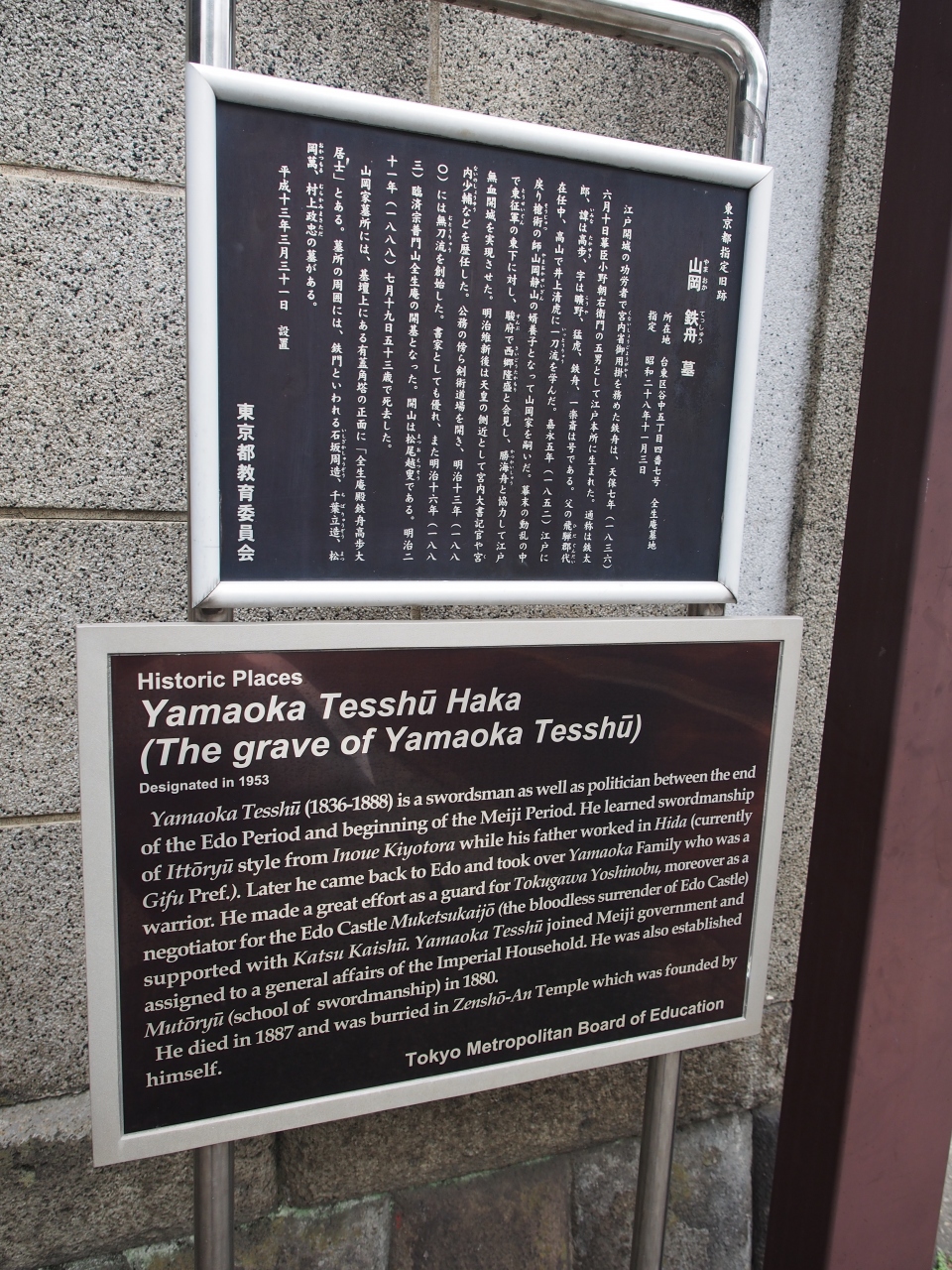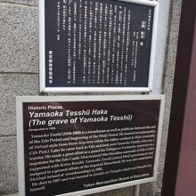 明治維新の偉人のひとりである山岡鉄舟のお墓です。全生庵の中にあります。(看板は入り口のもの)