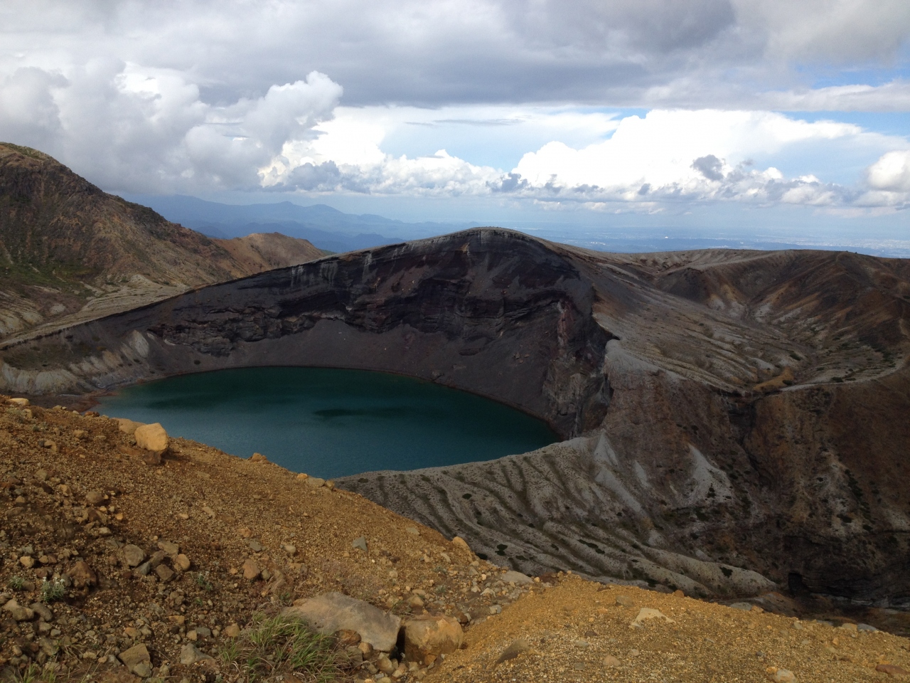 崖付近まで歩いて行くと目の前に御釜が出現します。予想以上に大きく迫力満点です。天気も良かったので周囲の緑と良いマッチしてて見事でした。山の天気は変わりやすく、リフトで戻るときには急に雨が。天候の変化にも備えていきましょう。