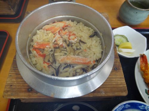 ランチの釜飯の種類は、日で異なるようです。行った日は、ホタテとカニ。どちらも単品では1100円。釜飯の量も十分。具材も多く、お腹いっぱい。