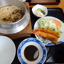 普通は単品で1000円以上する釜飯に、エビフライ2本、漬物、味噌汁が付いて1000円(税込)でした。。