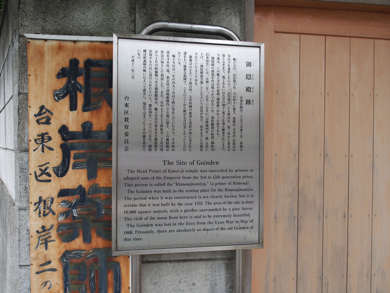 看板が立っていて、それによるとこの場所には、昔、親王が公務外時の休息の場として利用する輪王宮の別邸「御隠殿」というものがあったそうです。
