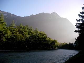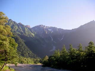 上高地バスターミナルに着いて、翌日の夕方のバスの整理券を発行してもらい、次に乗る平湯温泉行きのシャトルバスの発車まで時間があるので、遊歩道を歩いて近くの河童橋に向かいます。小梨平のあたりは観光客も来るところで、梓川のほとりに出ると朝霧が晴れて奥穂高岳から前穂高岳に続く吊尾根から岳沢がよく見えて、振り返ると焼岳が聳えています。