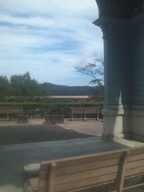 別項でもご紹介させて頂きましたが、明治村内における入鹿池のビュースポットとしては、品川燈台が一番良いように感じますが、あちらは人が常に多い印象で、特に休日は落ち着かないかと思います。その一方で少し離れただけのこの場所へは、何故か訪れる人も少なくて、静寂な一時を過ごすことが出来ます。入鹿池の展望もそれなりに楽しめますし、距離感としては、同じような建物である一丁目の東京盲学校車寄よりも入鹿池が近く望めますので、やはり展望を楽しみながらの休息にお勧めの場所です。