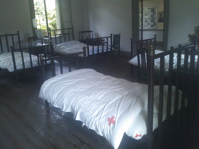 こちらの建物は、外観からしても三本の十字架を彷彿とさせる塔のような構造が印象に残りましたが、内部には当時の病院の様子が再現されていて、今とは違う空間配置に新鮮な驚きを感じました。また、入口付近には赤十字の巨大なレリーフが展示されていて、これも見応えがありました。