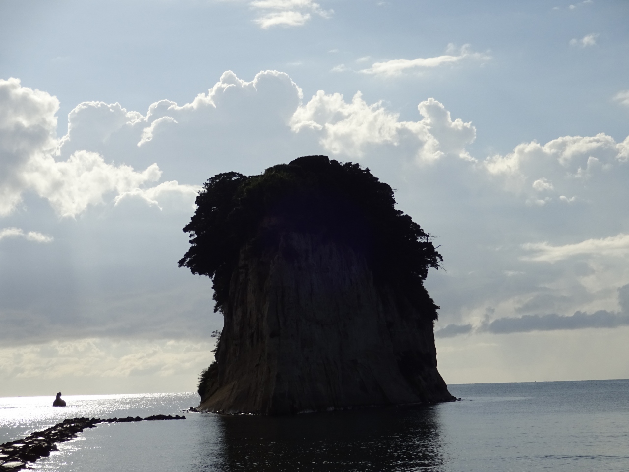 砂浜のなかに どーんという感じで切り立った岩というか島が立っています。