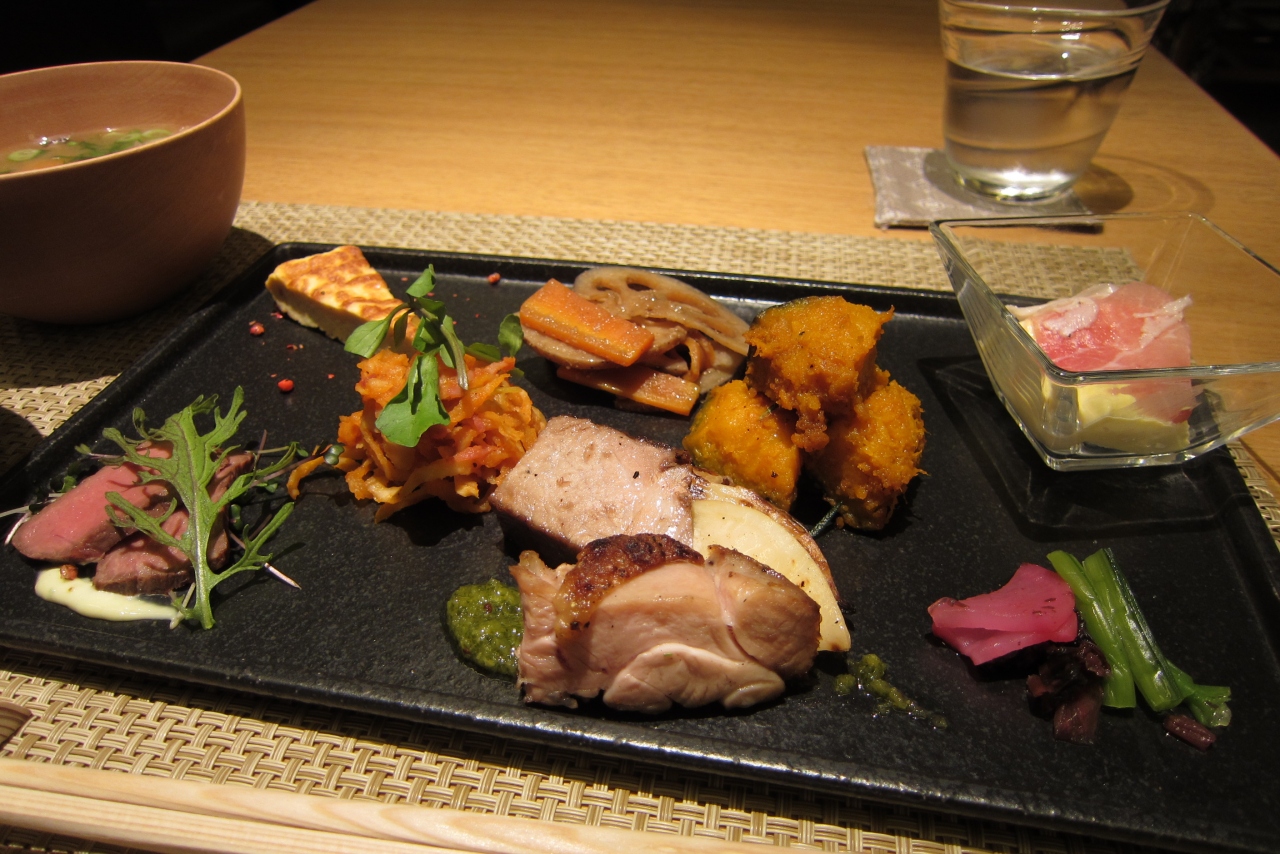 彩のきれいな野菜サラダ、メインのプレートはいろんなものが少しずつ盛合されていて女性にはうれしいものです。本来はイタリアンレストランということで、切り干し大根がトマト味になっていたりと、和風といってもちょっと一ひねりしてあるかんじです。
