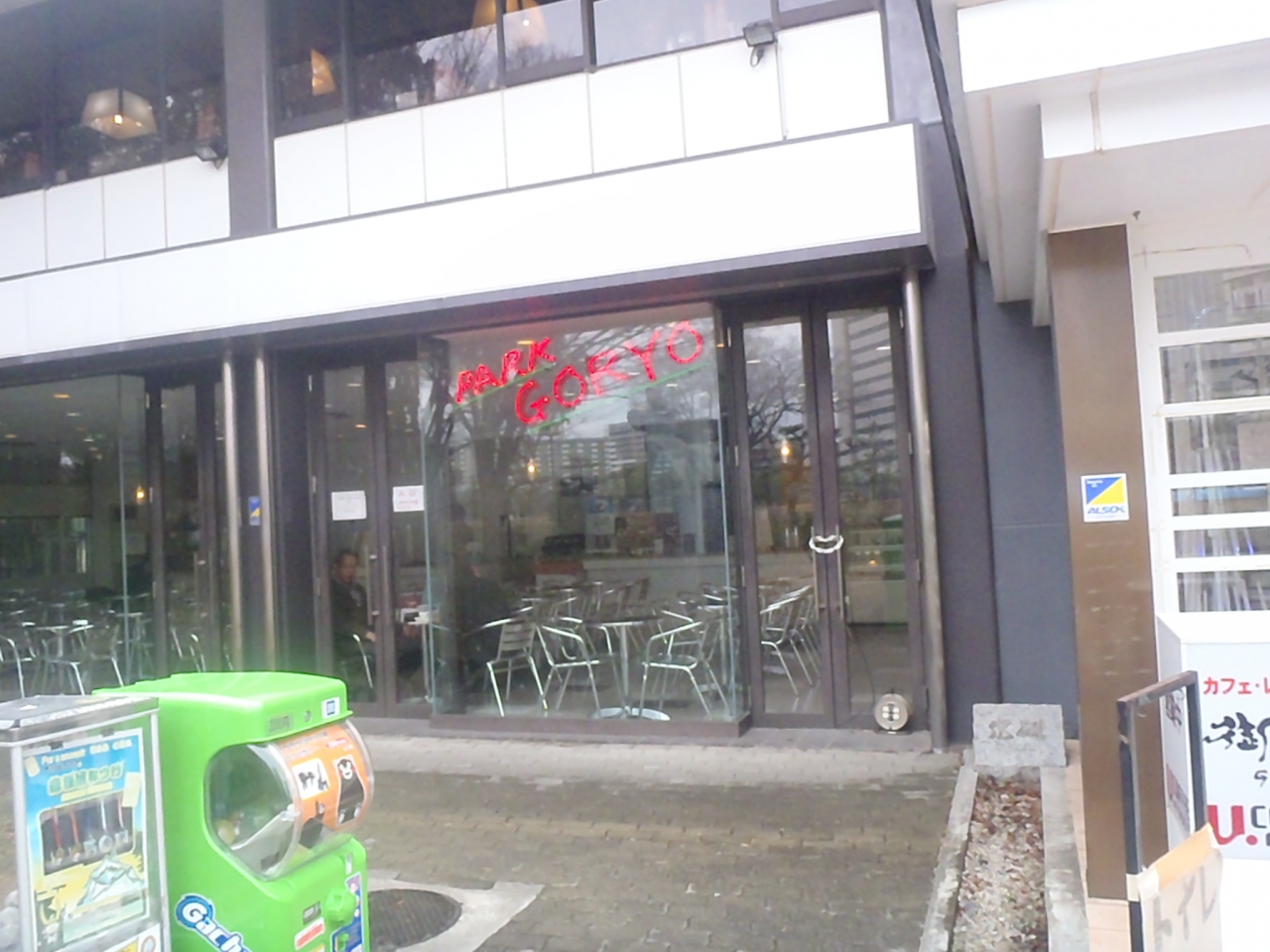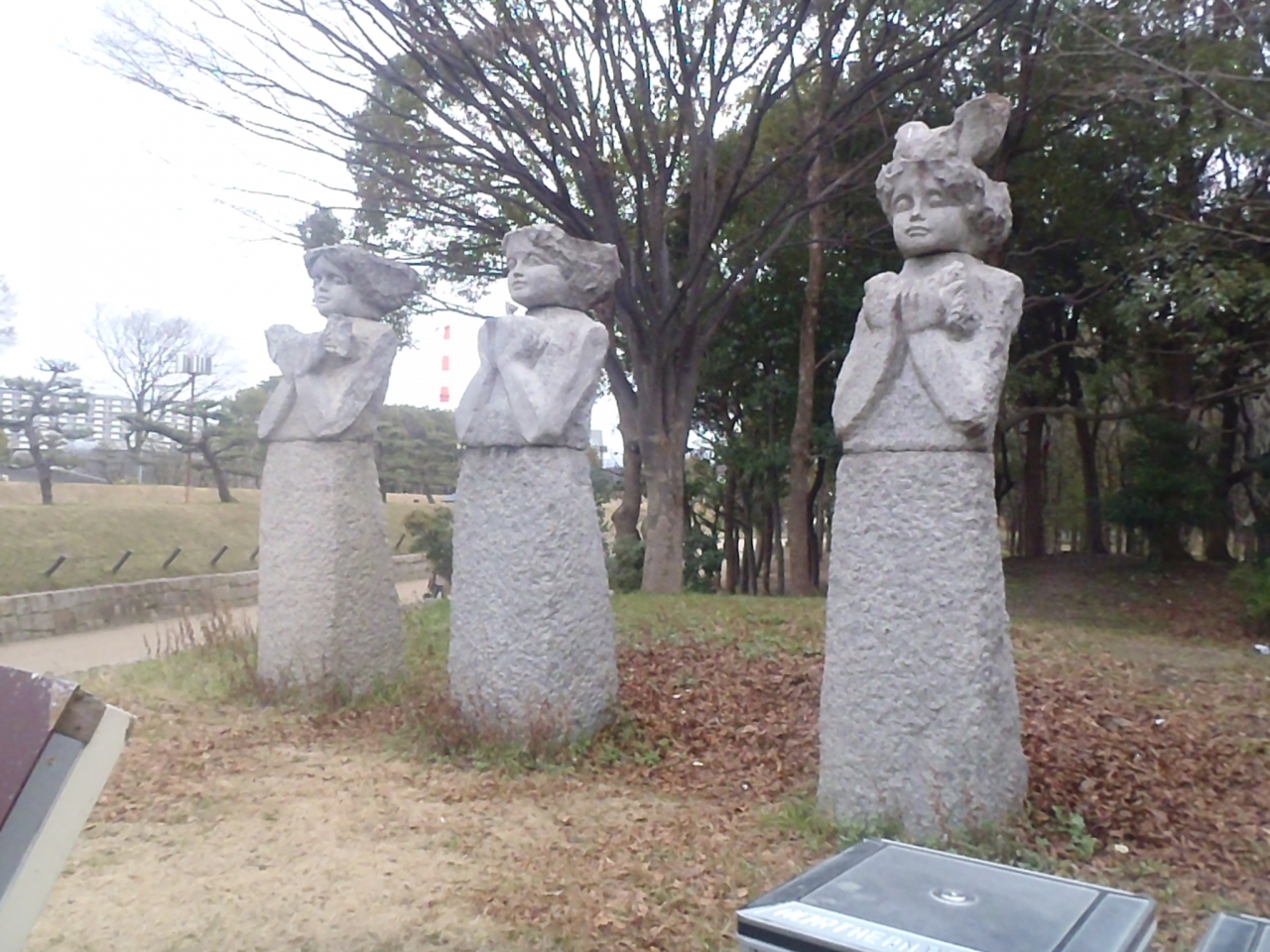 JR大阪環状線大阪城公園駅を下車して大阪城公園内を大阪城ホール方向へ進んで行くと、左手に女性像オブジェがあり、蒸気機関車の車輪をお店の前に展示しているレストランがあります。