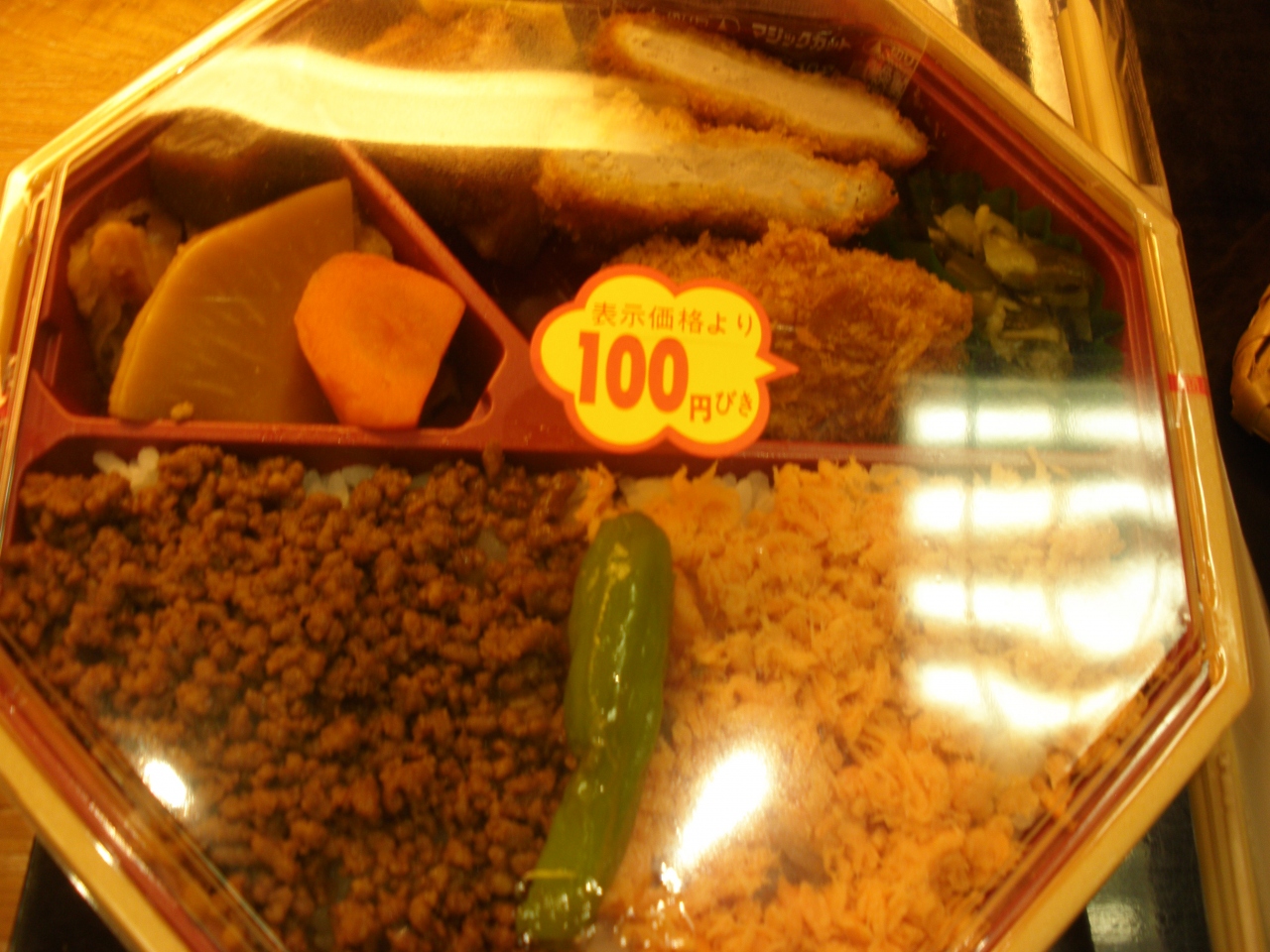 夕食は何にしようかと見ていたところ、100円引きシールがついたお弁当を発見しました。