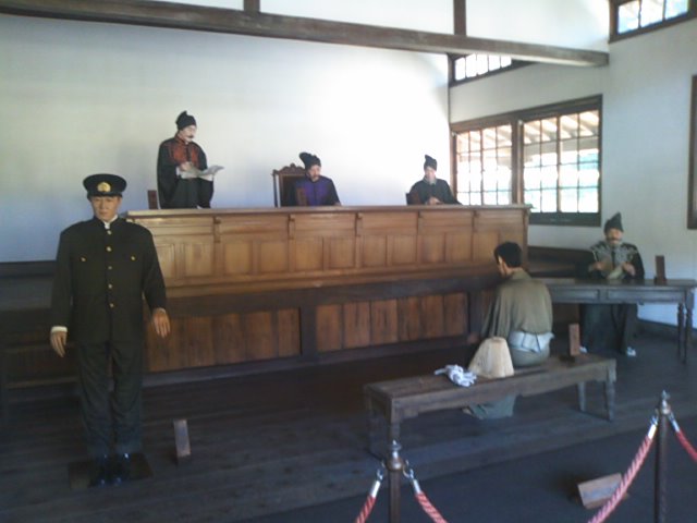 こちらの建物は裁判所建築の移築となっていますが、建物自体は横長の平屋風建築で、通常の立入可能な場所も入口付近だけなので、建物の風情を内側から味わうという意味では、やや趣に欠けるように感じました。ただ、入口では法廷の様子が蝋人形で再現されていて、この臨場感溢れる姿はなかなかの見応えでした。