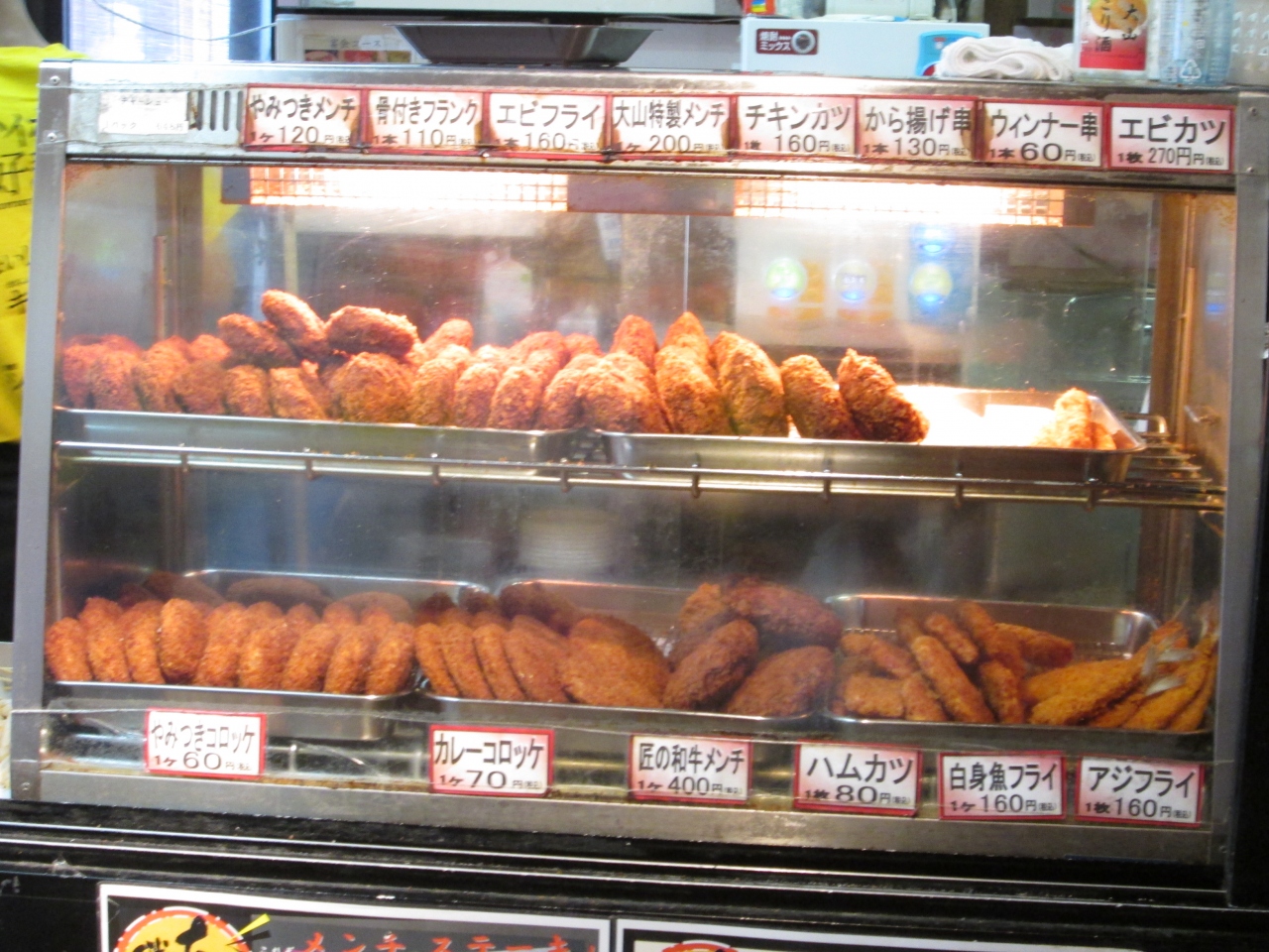 おやつにコロッケはいかかがですか、コロッケは60円からあります。お酒を飲みながら食べている人もいますが、コロッケ等揚げ物を食べるのも良いと思います。是非いかがでしょうか。