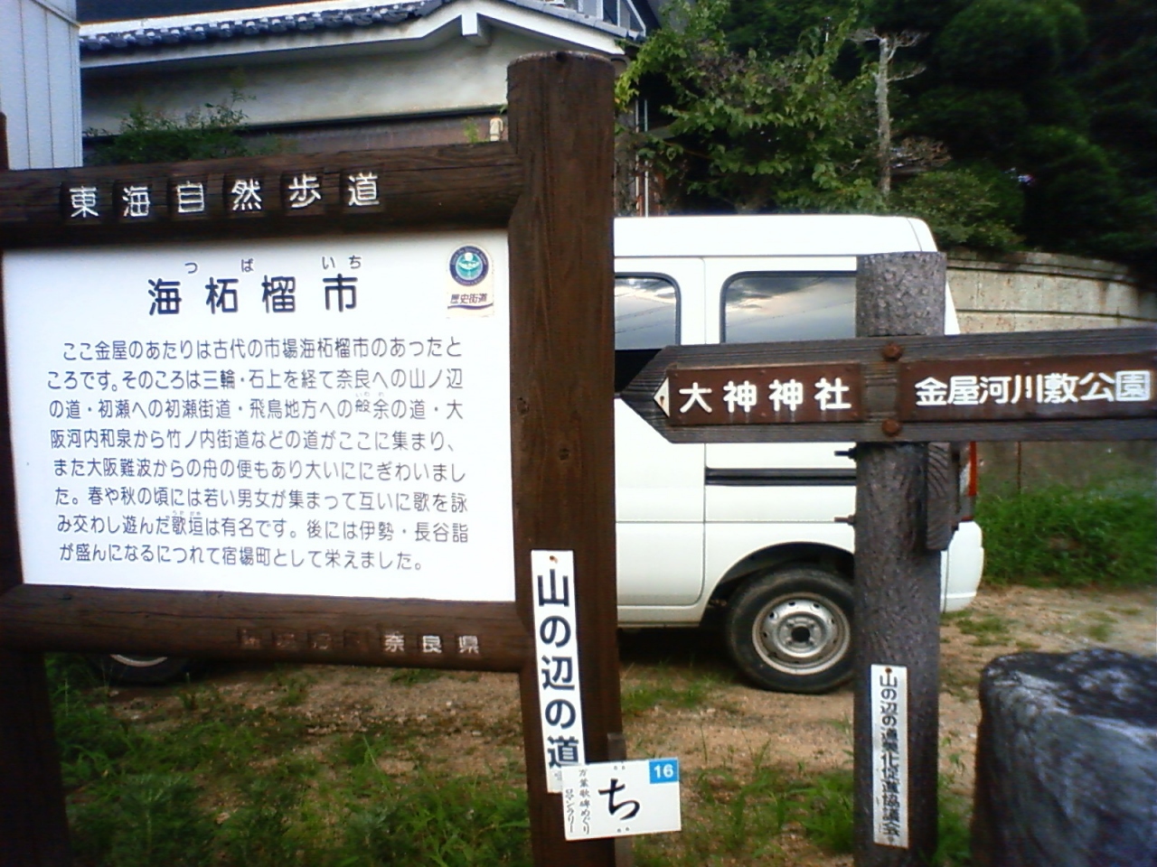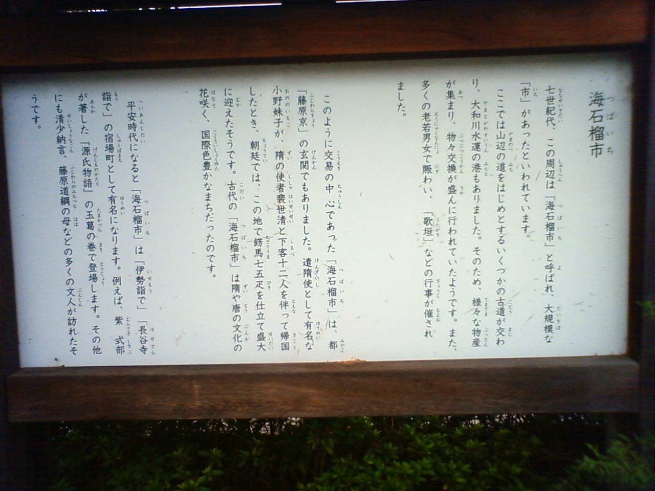 古代より交通の便がようこの地で市が栄えた後ですが今となっては面影もなく看板を読みながらこの地の利便性を考えながらの見学となります。イベントで当時をしのぶ形の海拓榴市が毎年9月の上旬に「万葉まつり」として行なわれているようです。