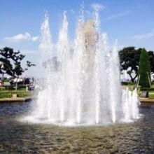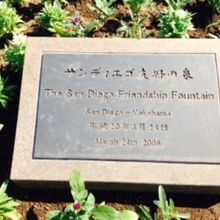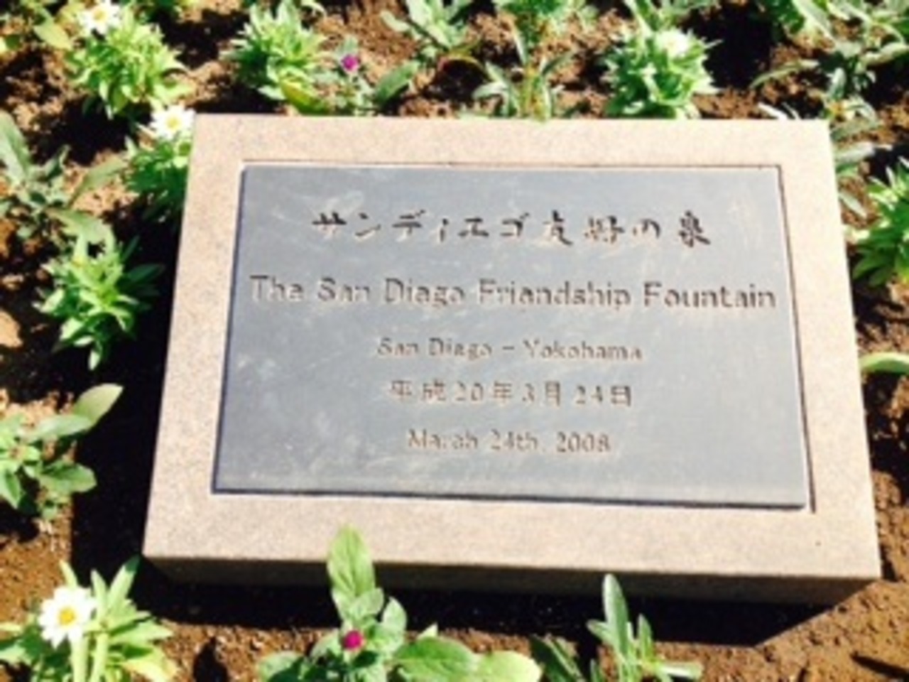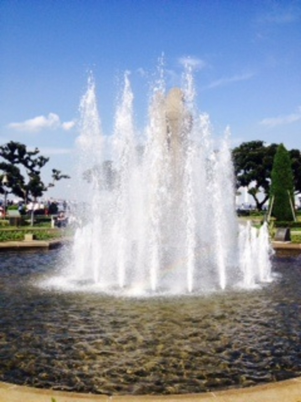 山下公園の沈床花壇内にあるフォトスポット。順番に皆が写真を撮るのだが、タイミングを取るのが難しい。何故なら噴水が最大になると、守護神像は見えなくなるし、水が小さいと、迫力がないからだ。サンディエゴ市からいただいたい像だそうだ。