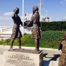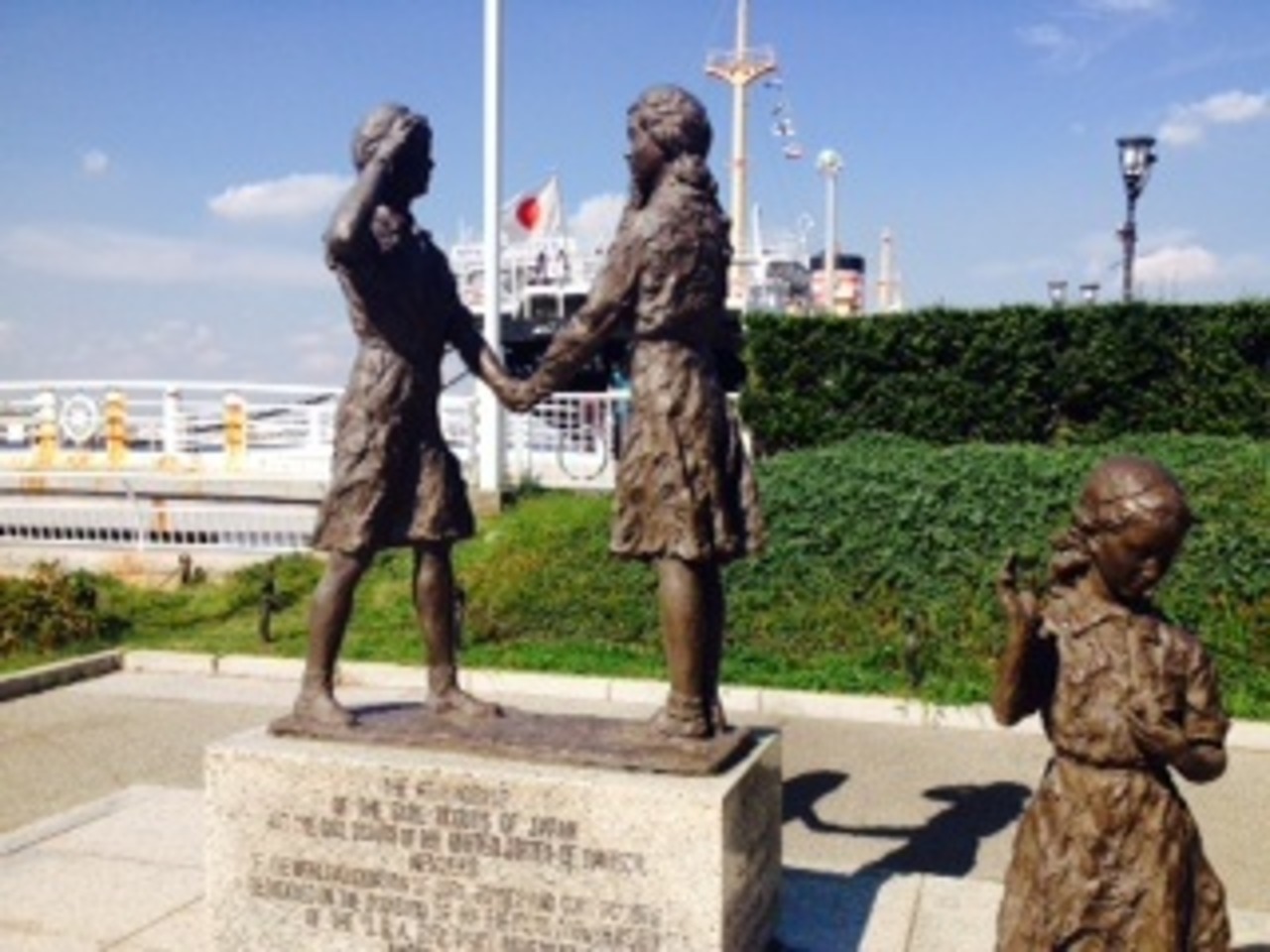 山下公園の沈床花壇内で氷川丸側に立っている。みずの守護神像からすぐ近くだ。日米の友好のため、握手し、敬礼している。「やくそく」という文字が、銘板に書かれている。3人目の女の子が何を表しているかが、少しわかりにくい。