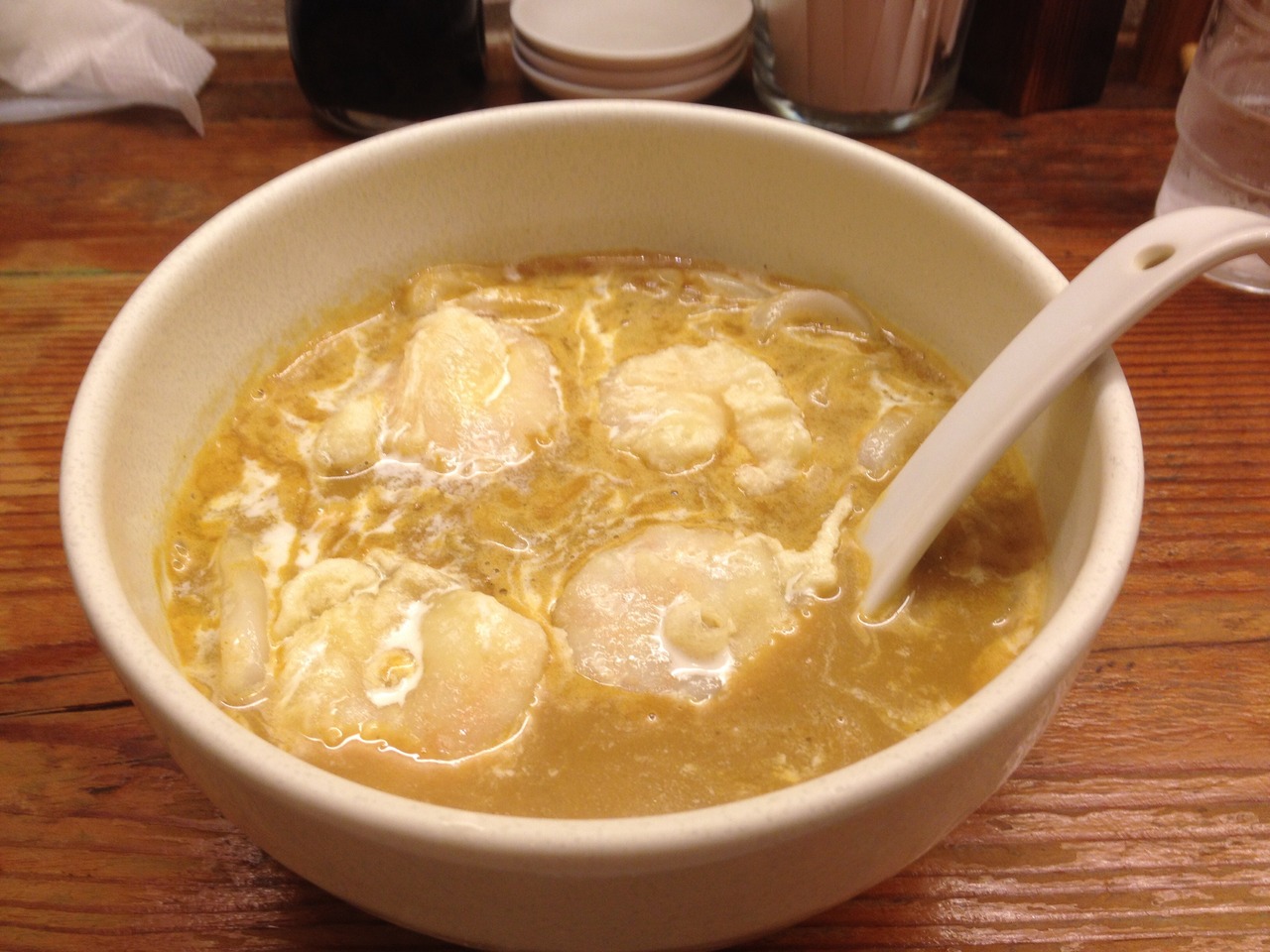 築地場外にある寿司屋さんですが、なぜか小エビ天カレーうどんが有名です。カレーがほどよく辛く、とろっとしてて超濃厚でした。うどんはコシのある讃岐風、小エビといえどエビは大きく、満足でした。1200円と高いですが、良かったです。
