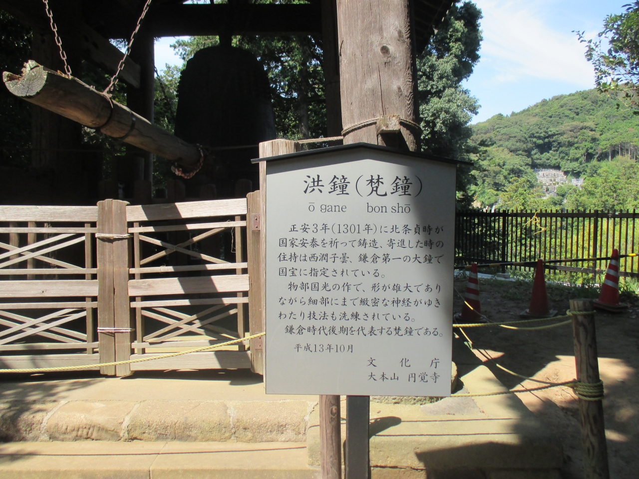 円覚寺山門の南側の長い階段を登ると弁天堂と洪鐘(おおがね)があります。この大きな鐘のため、北条貞時が江ノ島弁財天に参籠したあかつきに鋳造に成功したといわれています。
