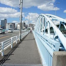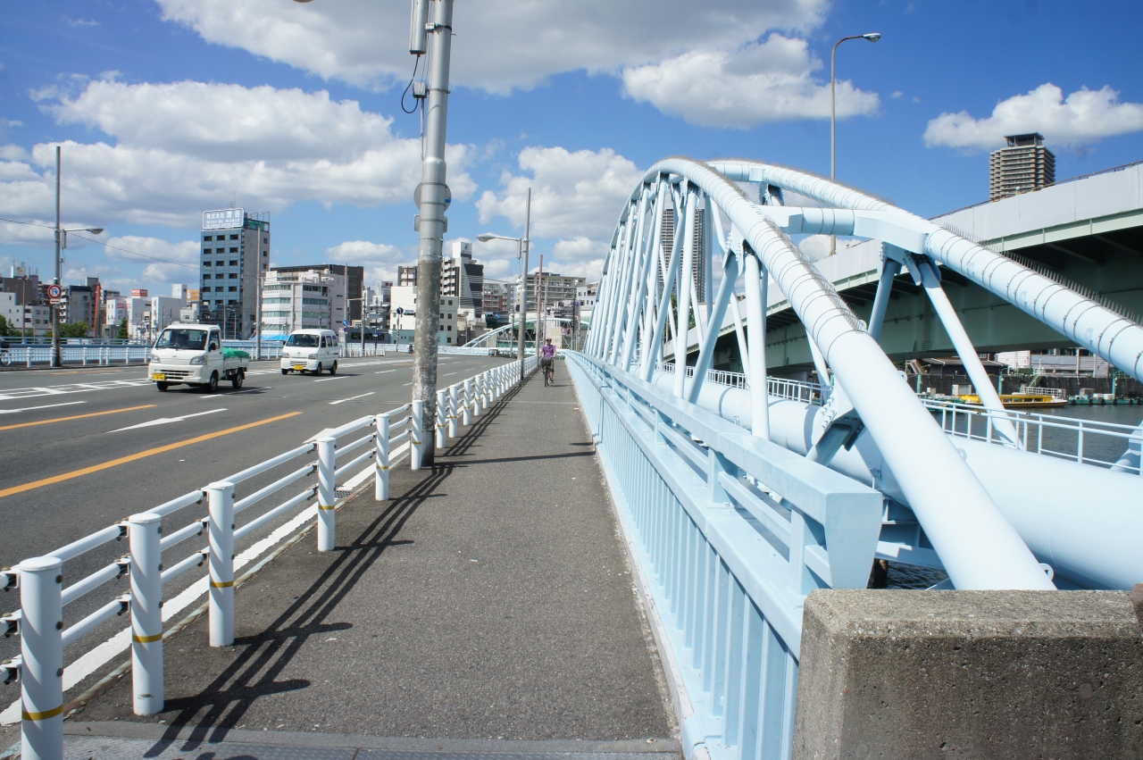 端建蔵橋は、かつての居留地だった川口地区と中の島の西端を結ぶ橋。現在の橋は、大正10年に架けられたもの。長さは、111.95m。橋に沿っては水道管が通っていて、景観としては、アーチ橋のように見えて橋と一体になっています。