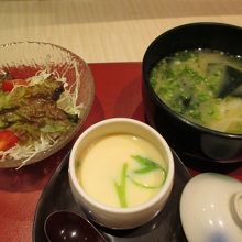 お味噌汁、茶碗蒸し、サラダがついて、とてもリーズナブル。