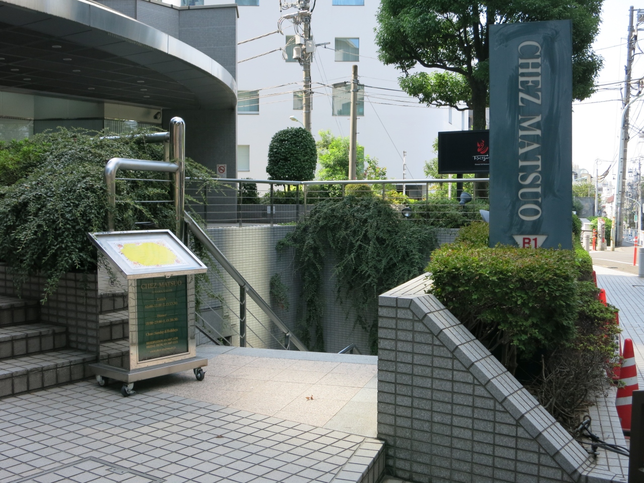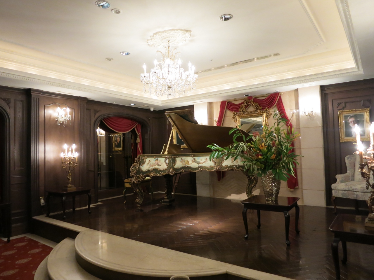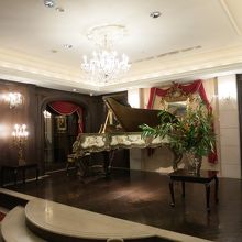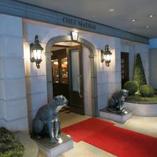 青山 こどもの城の脇の路地に入った所にあるビルの階段を下り地下1Fに行くと、入口で2頭の黒豹の置物が迎えてくれます。入口を入り右手に入ると、木調のラウンジの様なロビーがあり、仕切りを入るとバーカウンターとスタインウェイのピアノが置かれたアンティーク調の部屋にテーブルがセッティングされてました。