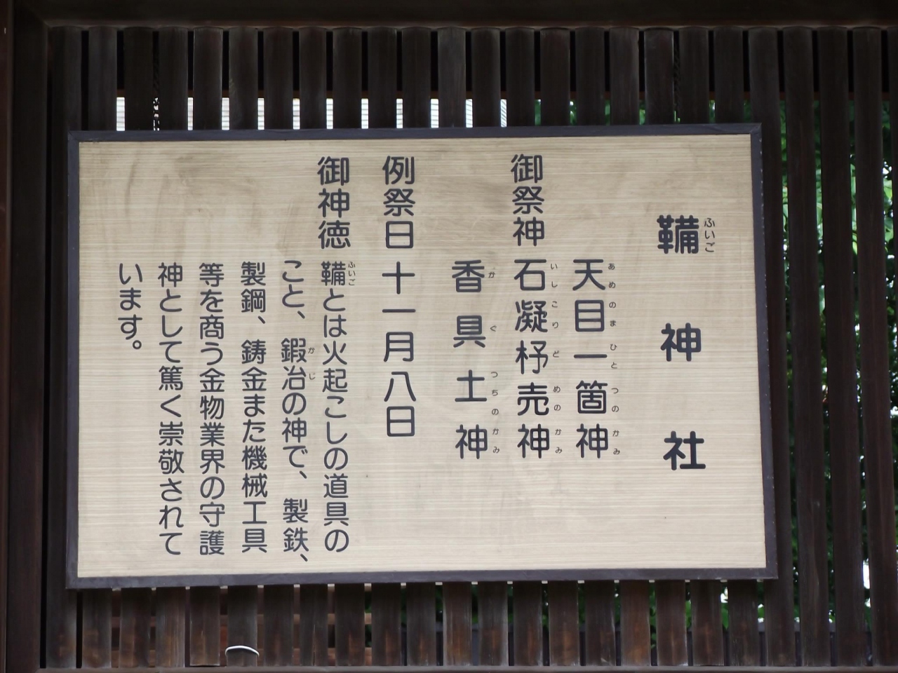 御祭神は 天目一箇神、石凝杼売神、香具土神